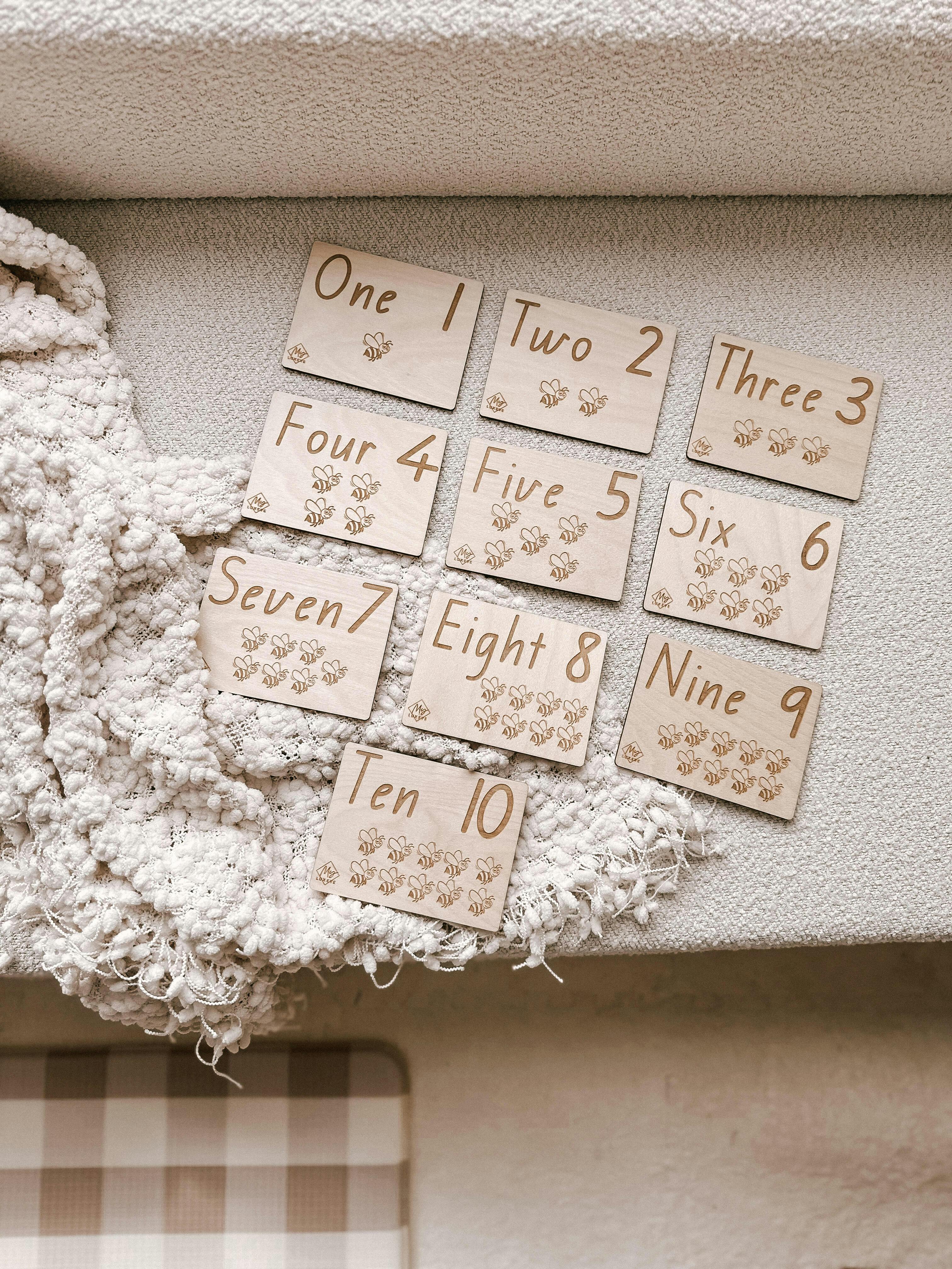 Our Bee Numbers Flashcards offer a natural and tactile way for kids to master numbers, making them an excellent choice for homeschooling and educational environments. Invest in these timber flashcards today to nurture your child's numerical skills with a touch of nature-inspired learning!